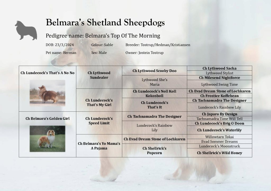 BELMARA’S TOP OF THE MORNING BELMArA’S TOP OF THE MORNING “HERMAN” Photo: Hanne Hedman Sable dog born 23.3.2024 Some show resultsCAC Share this: Share on X (Opens in new window) X Share on Facebook (Opens in new window) Facebook Like Loading...